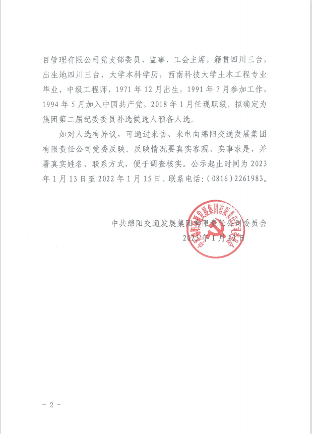中拱綿陽交通發(fā)展集團有限責(zé)任公司委員會<關(guān)于進行集團第二屆紀(jì)委委員補選候選人預(yù)備人選公示的通知>