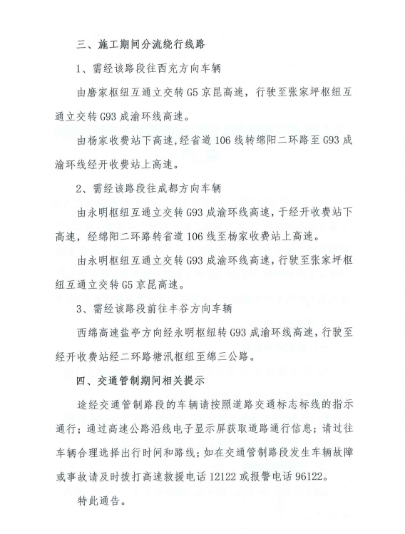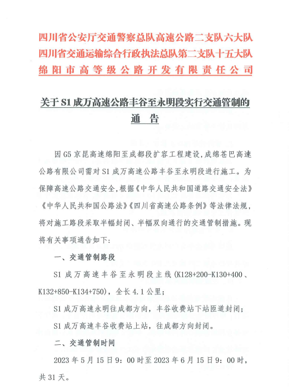 關(guān)于S1成萬(wàn)高速公路豐谷至永明段實(shí)行交通管制的通告