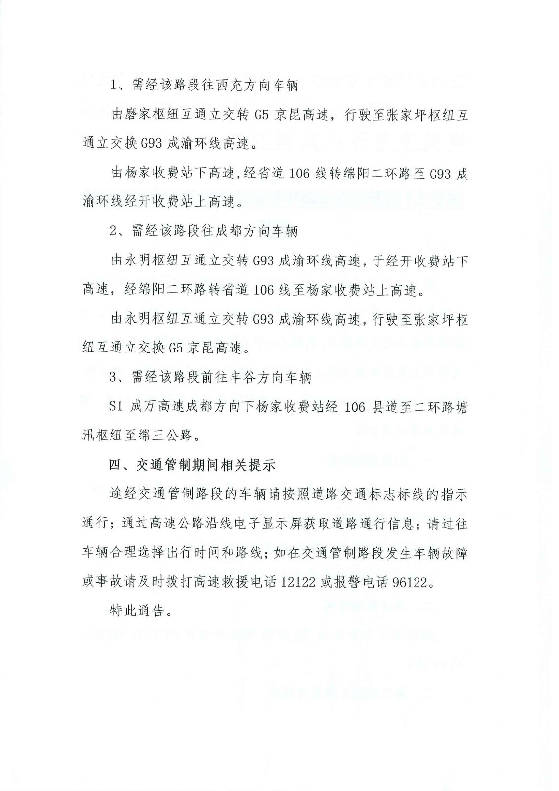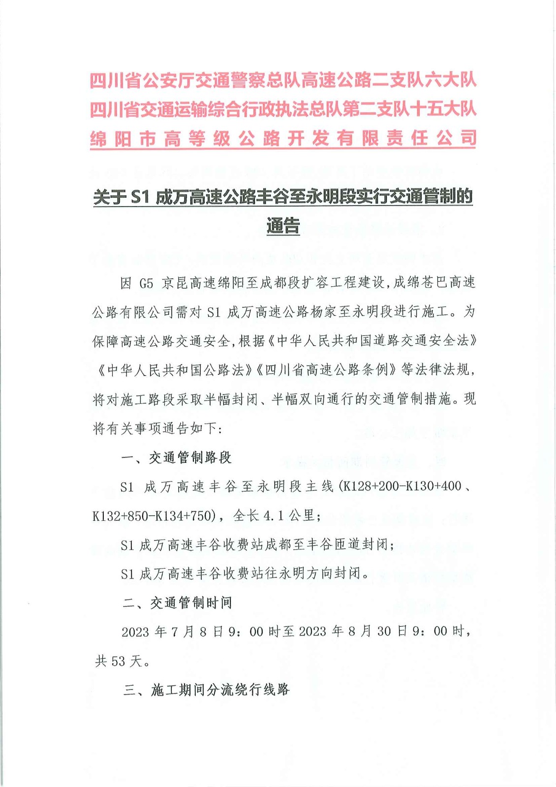 關于S1成萬高速公路豐谷至永明段實行交通管制的通告