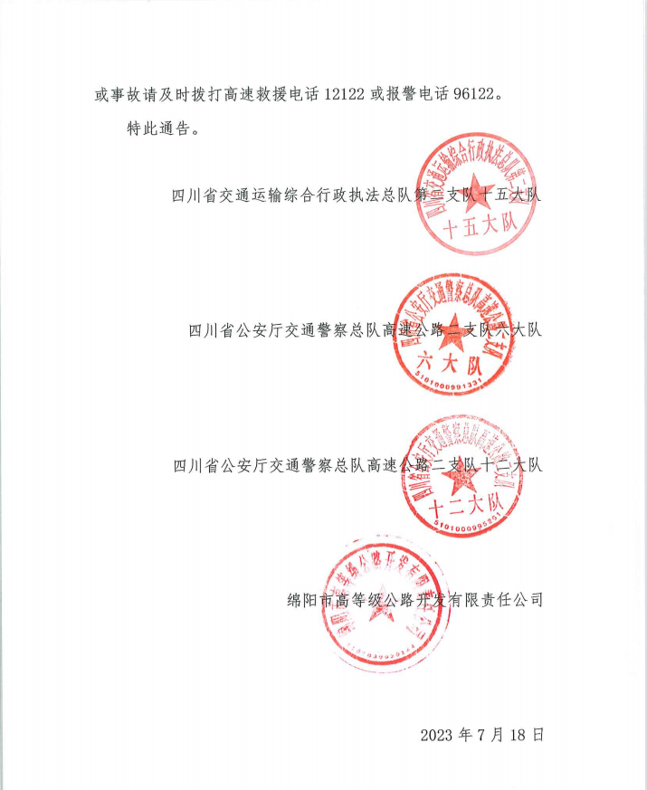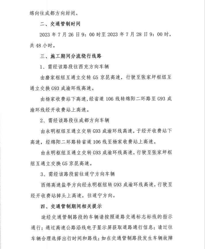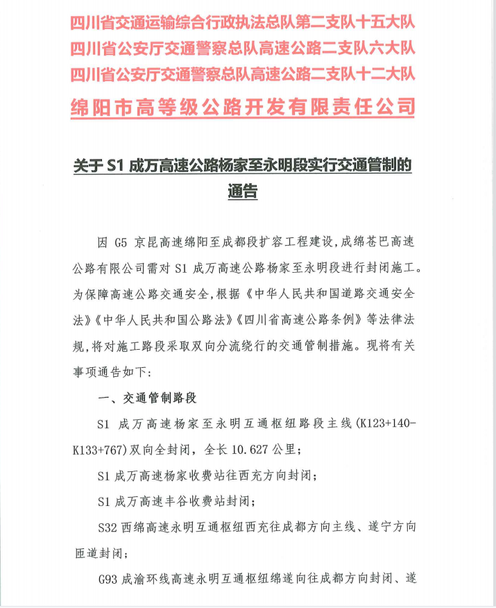 關(guān)于S1成萬高速公路楊家至永明段實行交通管制的通告