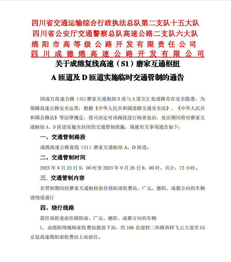 關(guān)于成綿復線高速(S1)磨家互通樞紐A匝道及D匝道實施臨時交通管制的通告