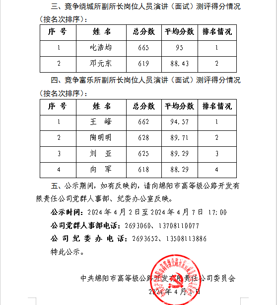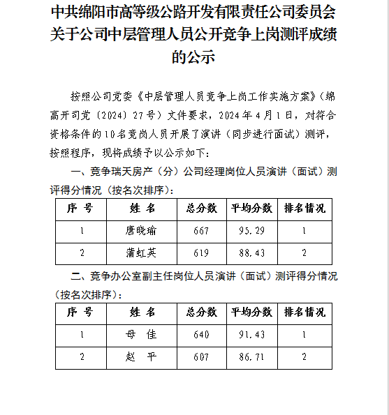 關(guān)于公司中層管理人員公開競(jìng)爭(zhēng)上崗測(cè)評(píng)成績(jī)的公示